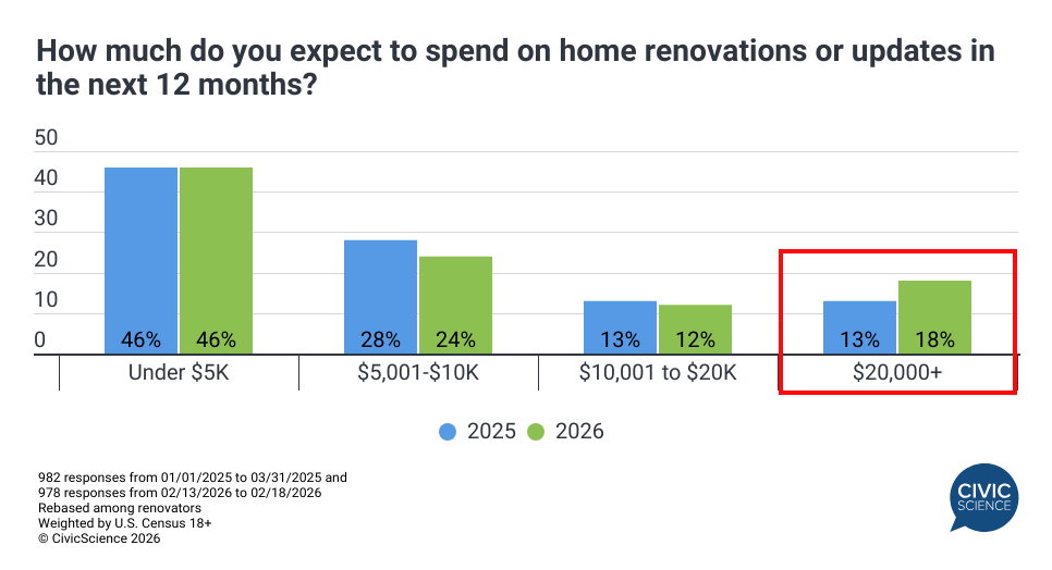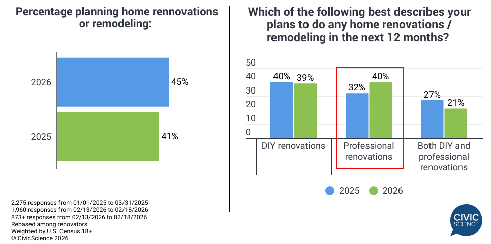 As the days grow longer and spring looms on the horizon, many will begin thinking about home improvement projects. However, amid ongoing economic uncertainty, the state of home improvements is more nuanced this year, and CivicScience has new data on what home improvement will look like in 2026:
