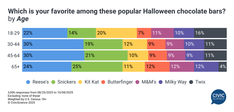 Not all Halloween candies are the same, however, and real-time consumer survey data reveals that Reese’s is the crowd favorite (27%), followed by Snickers (20%) and Kit Kat (13%). While Reese’s is most adored by Millennials and Gen X, Baby Boomers prefer Snickers, and Gen Z loves a Kit Kat.