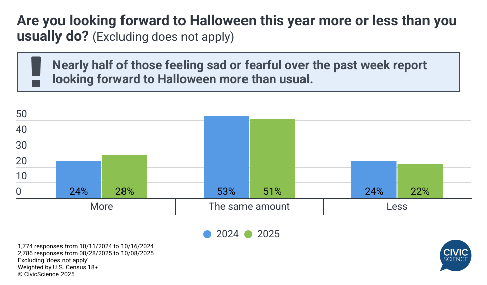 Gen Z adults and those making less than $50K are most looking forward to Halloween this year. And nearly half of those feeling sad and/or fearful are looking more forward to the holiday than usual–perhaps as a way to find a sliver of an escape from reality.