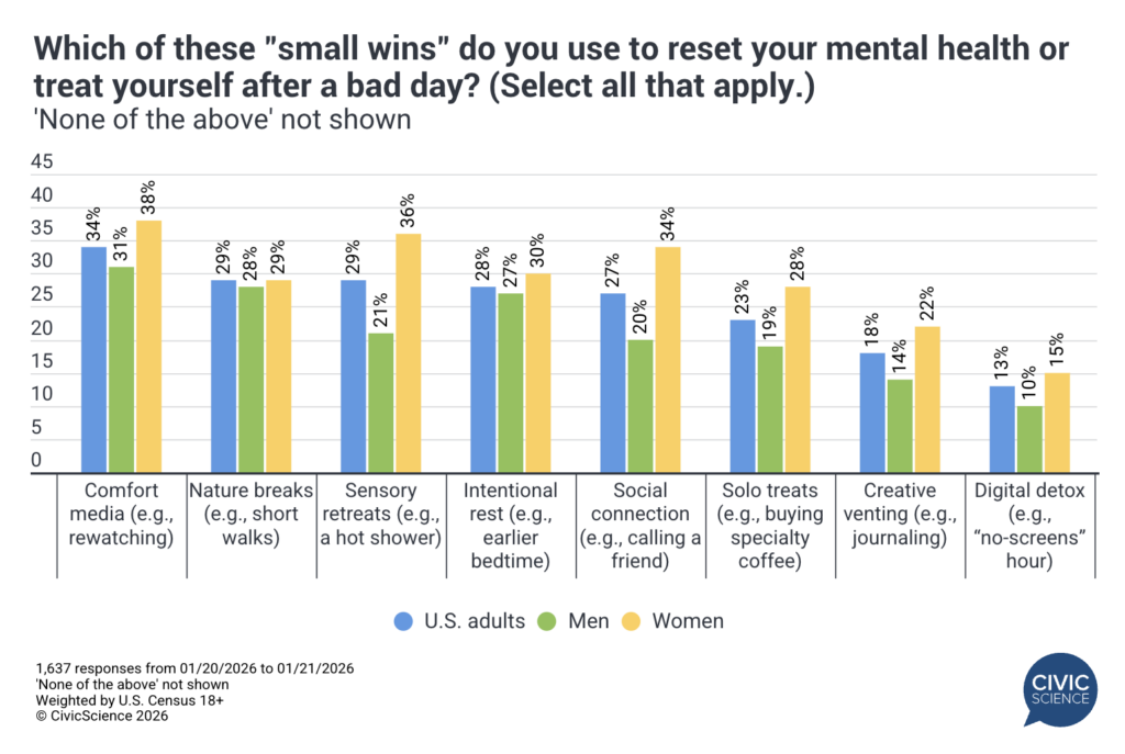 When addressing mental health and emotional recovery specifically, consumers favor low-cost, accessible “resets” such as comfort media, nature walks, and sensory retreats. The data reveal distinct demographic preferences for coping mechanisms. Women, for example, are notably more likely than men to unwind through sensory retreats, social connection, or buying themselves a small treat.