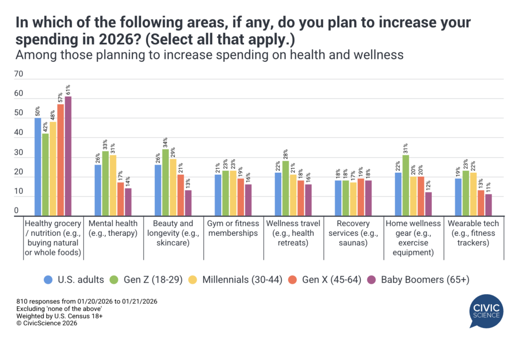Among those who say they plan to increase health and wellness spending this year, food and nutrition leads by a wide margin. Half expect to spend more on healthy groceries and nutrition products, making it the most common form of investment in personal health.