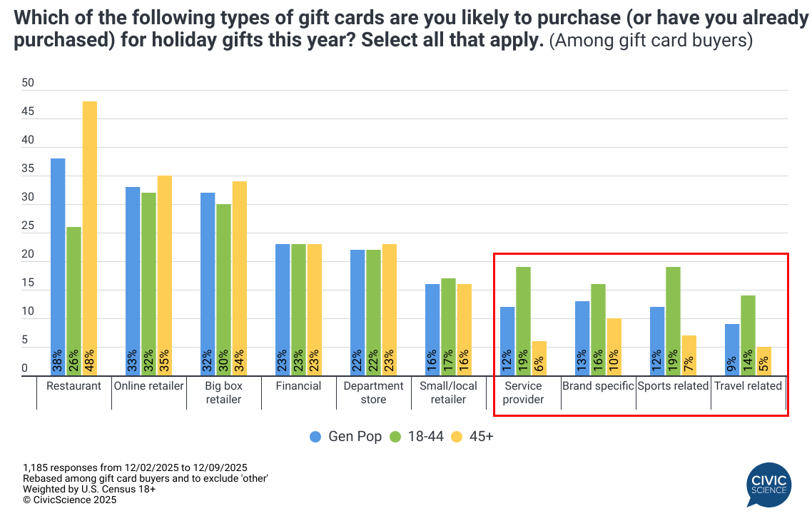 The most popular gift cards to get this year are for restaurants, particularly among shoppers 45+, followed by those for online retailers and big box stores. Among adults under 45, who are buying the most gift cards this year, the selection differs slightly: Gen Z and Millennial shoppers are primarily buying gift cards for online retailers and big box stores like everyone else, but where the Gen Pop favors restaurants, Gen Z and Millennials favor service provider gift cards – like Uber or DoorDash – and those for sports-related purchases.