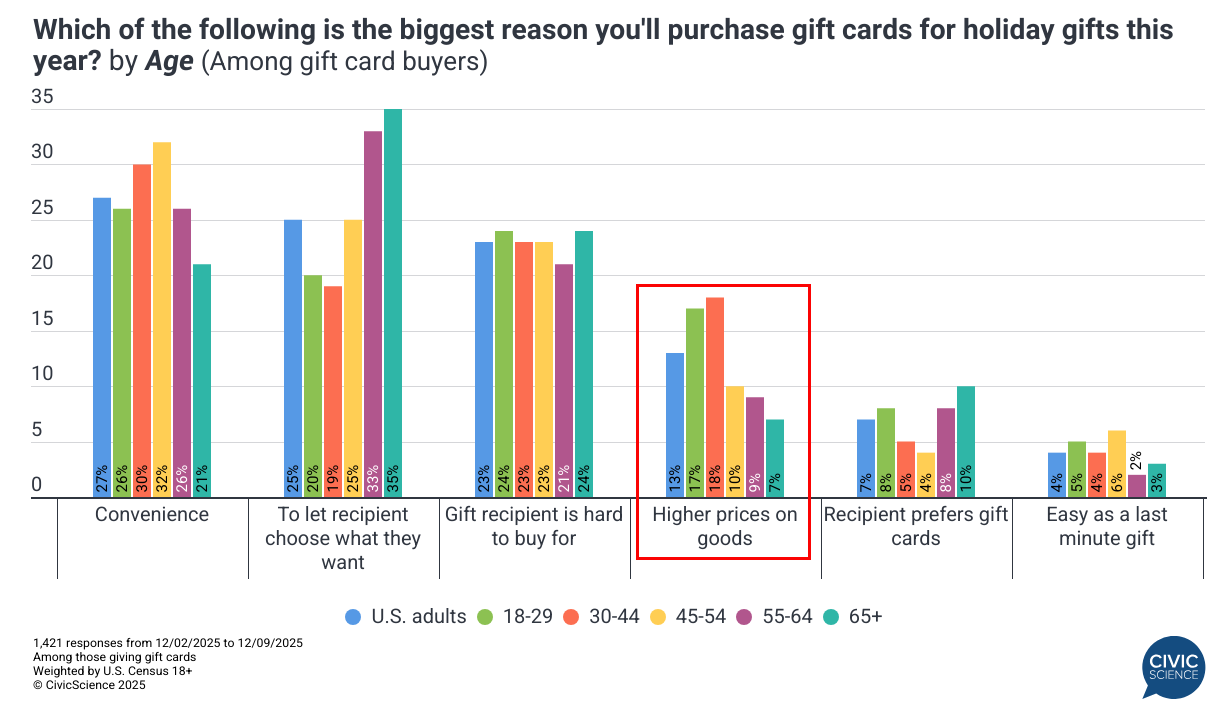 When broken down by age, Millennials and Gen Z are the top gift card buyers this year, over-indexing the Gen Pop by five to six percentage points. Convenience remains the primary driver for these consumers, but they are also much more likely to cite high prices as a reason for purchasing gift cards.