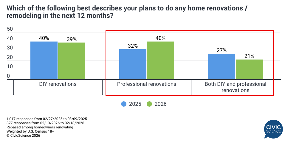 And although year-over-year intent hasn’t changed dramatically, consumer-reported data reveals notable shifts below the surface in HOW the work will get done this year. So far in Q1 2026, home improvement intenders are increasingly likely to hire a professional, with 40% planning to have a professional handle the work entirely, up eight points from 32% in Q1 2025. And while a similar percentage plan to do all the work themselves, they are particularly less likely to take the hybrid approach, combining some DIY work with some professional work.