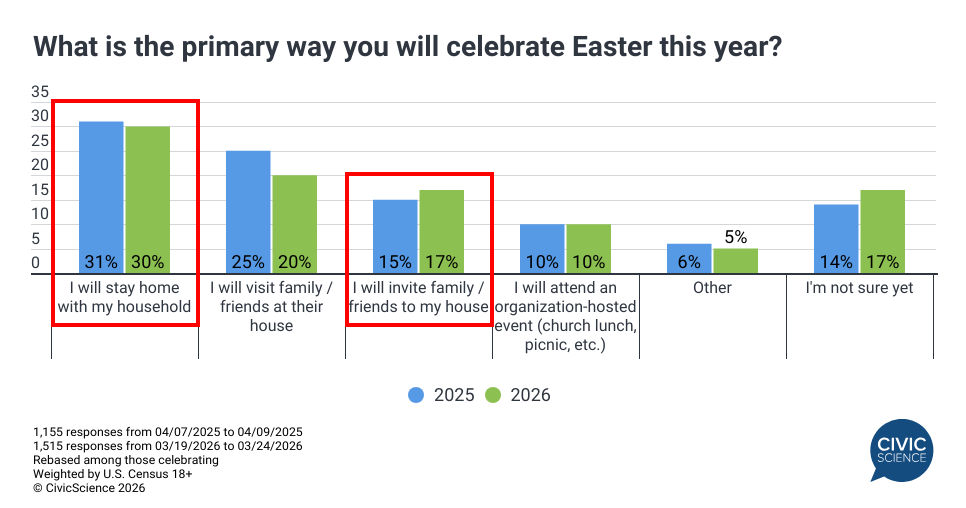 The plurality (47%) will celebrate Easter at home, either with those in their own household (30%) or hosting friends and family (17%). Twenty percent plan to visit friends or family (-5 points from 2025), 10% are heading to public events (same YOY), and 17% are unsure about their plans (up from 14%).