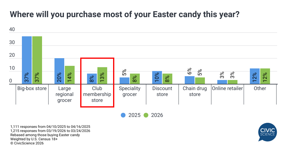 For those who are purchasing Easter candy, big-box stores remain the top destination, outpacing all other retailers by at least 23 points. However, a significant shift is underway among secondary options as financial pressures hit home. While shopping plans at large regional grocers are down six points from 2025, intent to shop at a club membership store is up by five points, suggesting that consumers are increasingly prioritizing bulk value to stretch their holiday budgets.