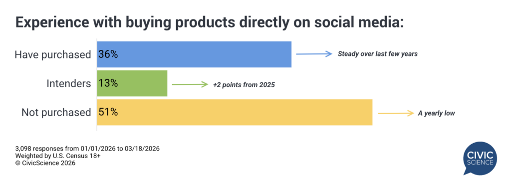 Key Finding: More than one-third (36%) of U.S. adults now say they’ve purchased an item directly through social media, while another 13% haven’t yet, but plan to. While adoption appears to be stabilizing, intent is at an annual high and continues to grow, signaling that there’s still an untapped market.