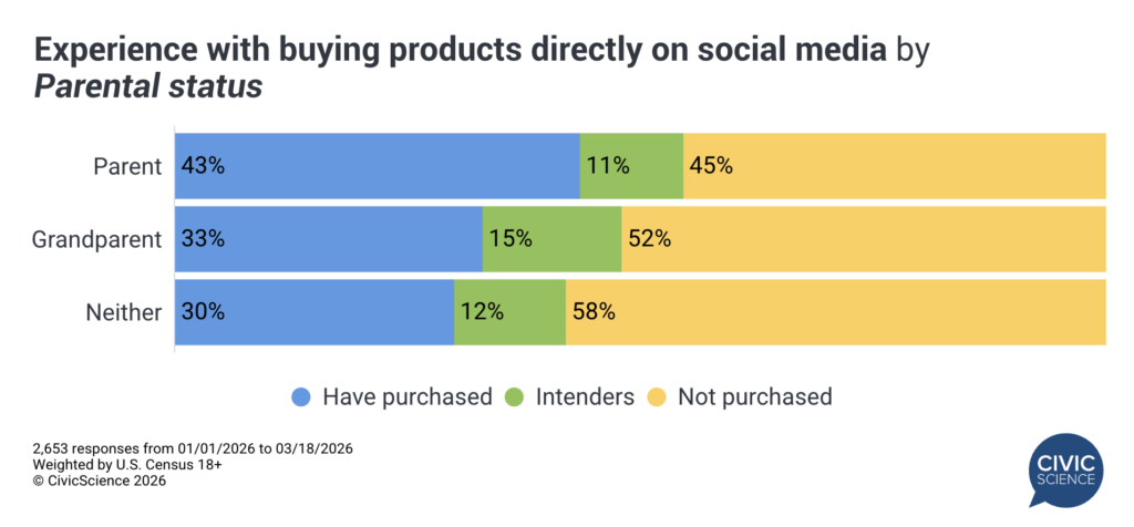 Parents also stand out as a particularly engaged audience. Just over two-fifths (43%) say they’ve made purchases directly through social media, outpacing grandparents and non-parents by at least 10 points.