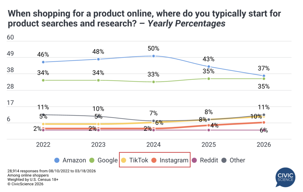 The growth in social media platforms as search engines comes as TikTok Shop usage overall reaches a high of 35% so far in 2026, up from 23% in 2025.