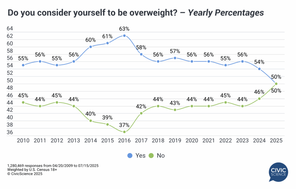Since 2010, CivicScience has asked a representative sample of nearly 1.3 million U.S. adults (roughly 2,500 per week) the following question: “Do you consider yourself to be overweight?” At its peak in 2016, 63% of Americans answered ‘yes’ to that question. However, you can see in the chart below that things have changed quite significantly. As of July 2025, 50% of U.S. adults consider themselves to be overweight, the lowest yearly average to date.