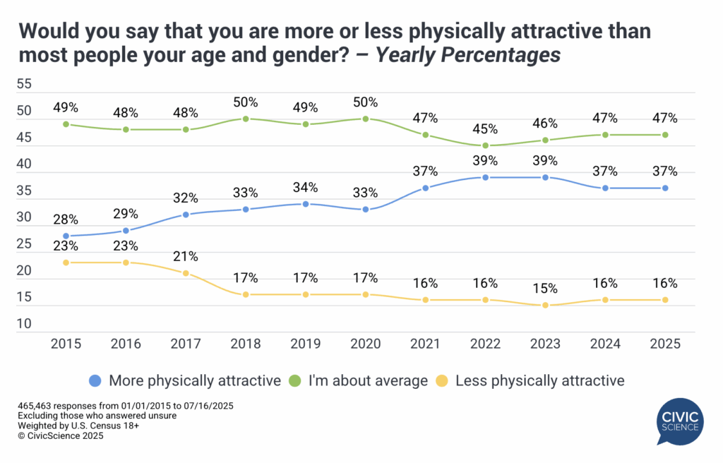 Not coincidentally, a different question we’ve asked since 2015 (n= 465,463) – gauging people’s perception of their relative physical attractiveness – has followed a similar pattern. Starting in 2017 and accelerating coming out of the pandemic, the percentage of Americans who believe they’re more attractive than their peer group has been on a steady rise, if slowing over the past two years.