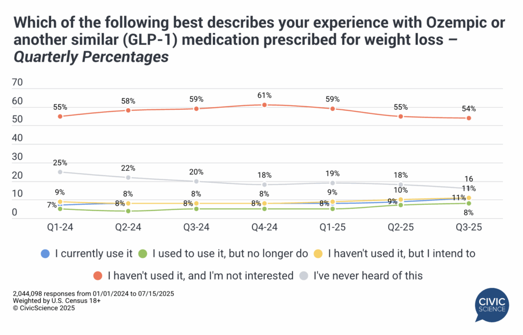 One obvious explanation could be the proliferation of Ozempic and other GLP-1 drugs. According to CivicScience tracking data (n= 2,044,098), roughly 1 in 10 U.S. adults are currently taking one of these medications, while another 8% have used them at some point and later quit. Even if those quitters regained whatever weight they lost, the combined numbers likely made a big dent in the population-wide obesity in America.