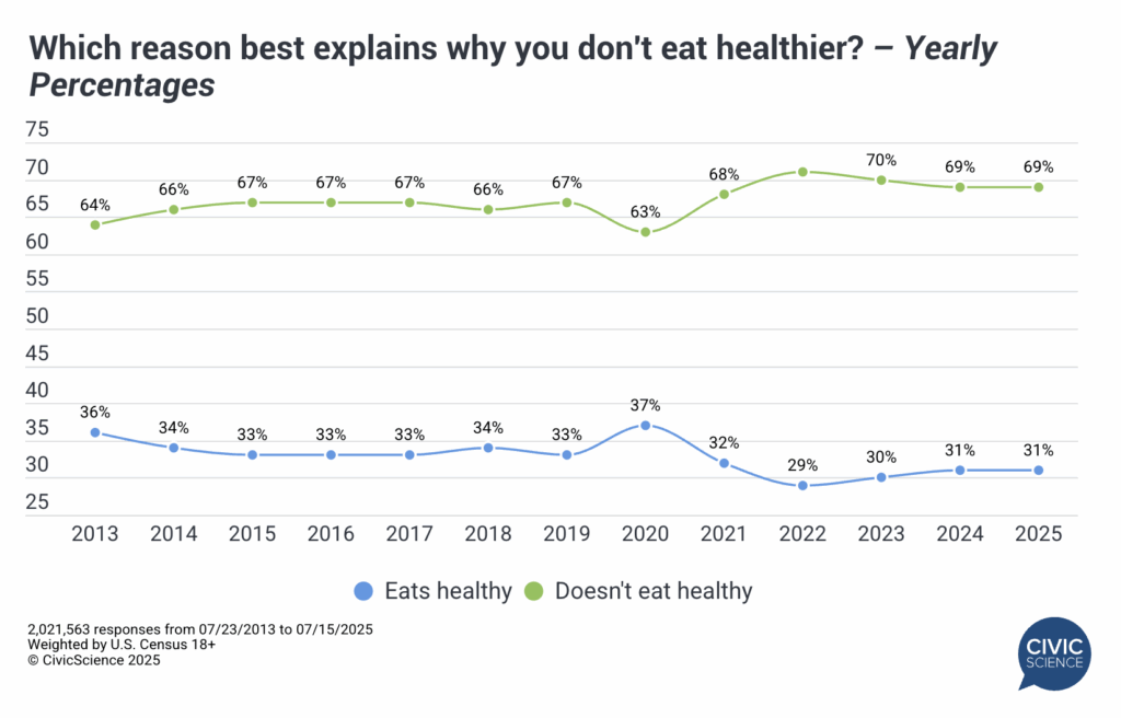 We’ve been asking Americans about the ifs, whys, and whynots of their healthy eating habits going back to 2013 (n= 2,021,563). In that first year, 36% of U.S. adults identified themselves as healthy eaters. That number decreased to 33% in 2019, before spiking to 37% in 2020, then fell in subsequent years, sitting at only 31% today. The financial costs of buying healthy food amidst all the inflationary headwinds are partly to blame. In any event, no, it doesn’t appear healthy eating is the hero in our story.