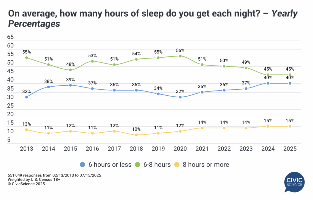 Ample research and medical recommendations will tell you that a lack of sleep (and resulting low energy) strongly correlates with body weight issues. It would make sense, then, if we saw a population-wide improvement in sleeping habits corresponding with our declines in obesity. Well, we don’t. The results have remained relatively consistent after tracking Americans’ reported hours of nightly sleep since 2013 (n= 551,049). While the number of U.S. adults who report sleeping less than 6 hours per night fell from 39% in 2015 to 32% in 2020, that group has jumped back to over 40% by 2024. The percentage who get the advised 8+ hours of nightly sleep has sat steadily between 11% and 15% of the total population. In other words, it’s hard to attribute our shrinking lbs to our increasing z’s.