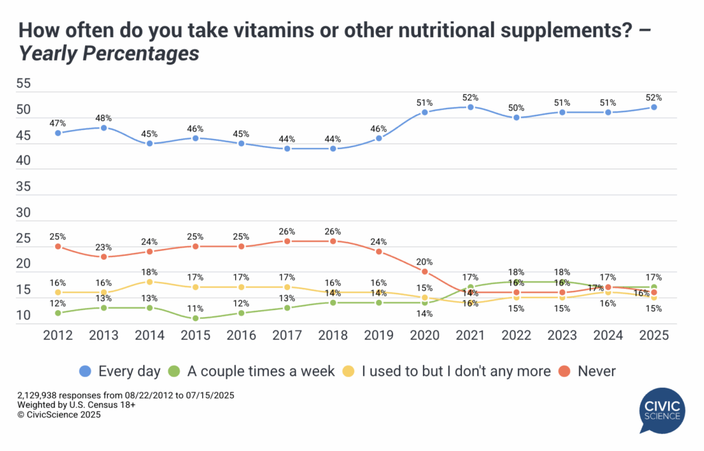 One viable way to lose weight (or at least slow weight gain) is to offset our unhealthy eating habits with the plethora of dietary supplements readily available to consumers today. CivicScience data reveals a similar trend. The percentage of U.S. adults who report taking daily vitamins or supplements has jumped from 44% in 2017 to 52% today. Another 17% take them at least a couple times a week, up from 13% in 2017. The empirical data confirms this as well: The vitamin and supplement market in the U.S. has more than doubled over the past 10 years.
