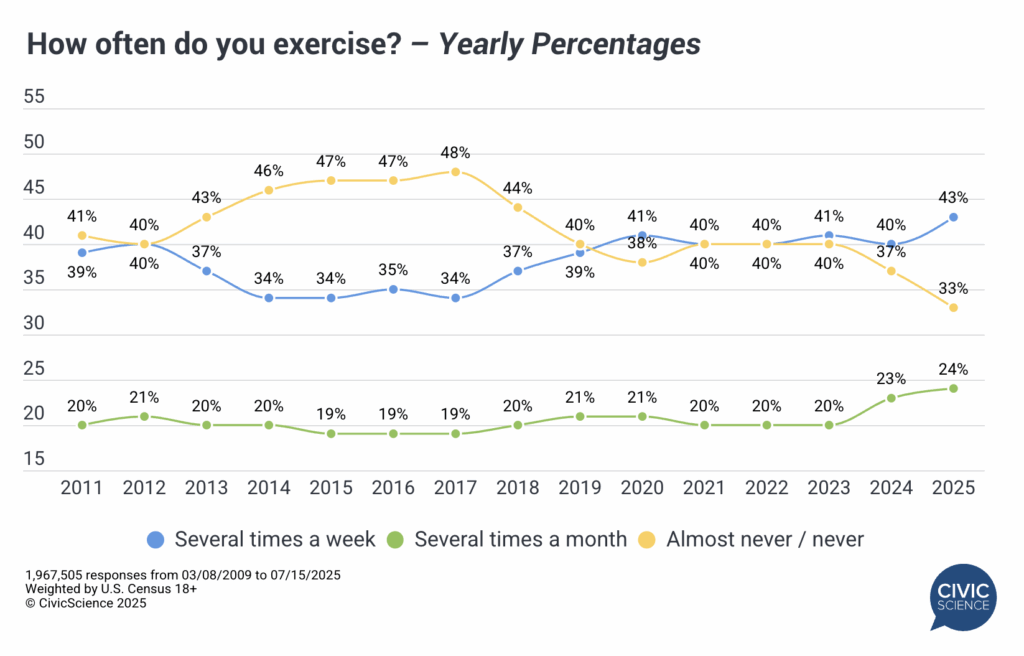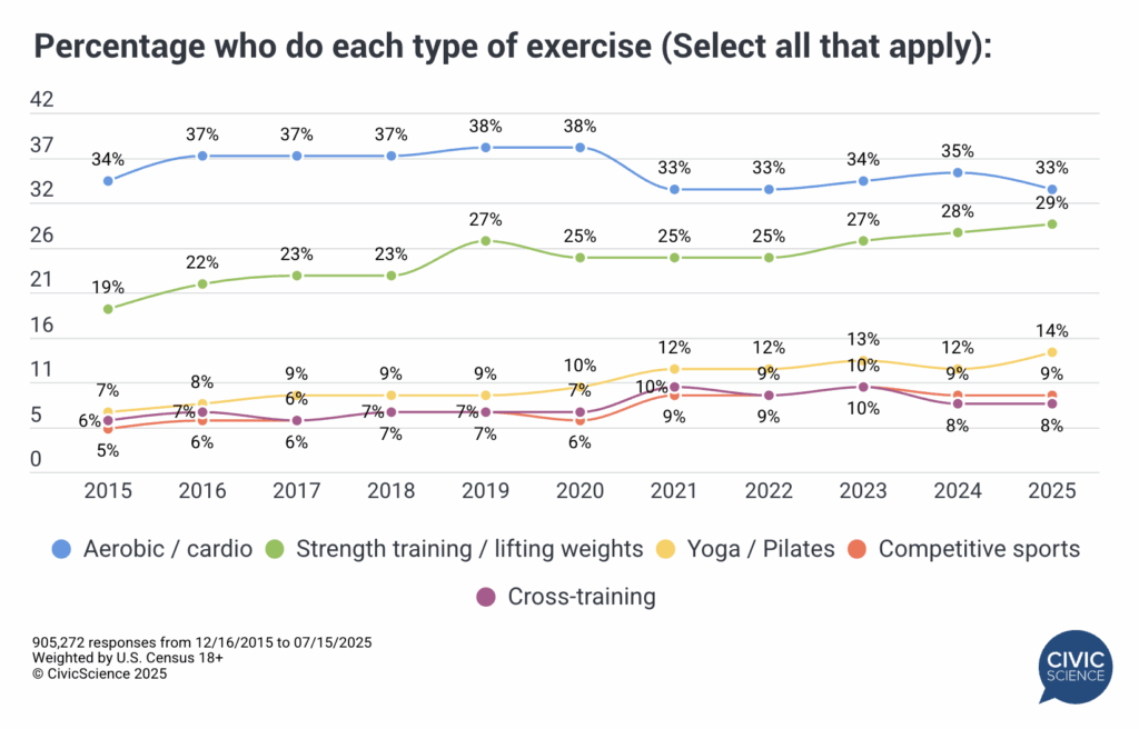 Another category of exercise that has seen major leaps since 2015 includes studio activities like yoga and pilates. The percentage of Americans who report they regularly partake in one of these physical outlets has climbed from just 7% of the population in 2015 to 14% in 2025, representing the largest relative increase (+100%) over the trended period.