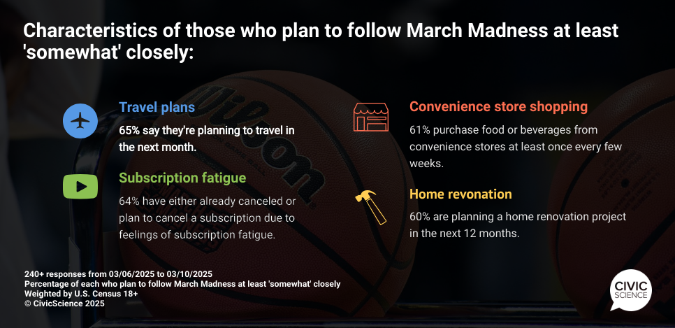 As March Madness approaches, a potential dip in viewership signals possible challenges ahead for the NCAA and its advertising partners, particularly as NIL deals reshape college sports. Sports betting, however, may serve as a short-term stop-gap. For those targeting viewers, CivicScience data offers valuable insights into key consumer behaviors, helping advertisers tailor their strategies amid an economic climate of uncertainty and tightening consumer budgets.