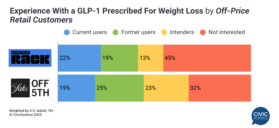 The data suggests Saks OFF 5TH may be attracting consumers who are actively thinking about or investing in body transformation—shoppers who might be looking to refresh their wardrobes as part of that journey and seeking premium brands at accessible price points. CivicScience’s complete GLP-1 dataset reveals that shoppers taking this medication are purchasing different types of clothing compared to when they first started taking a GLP-1.