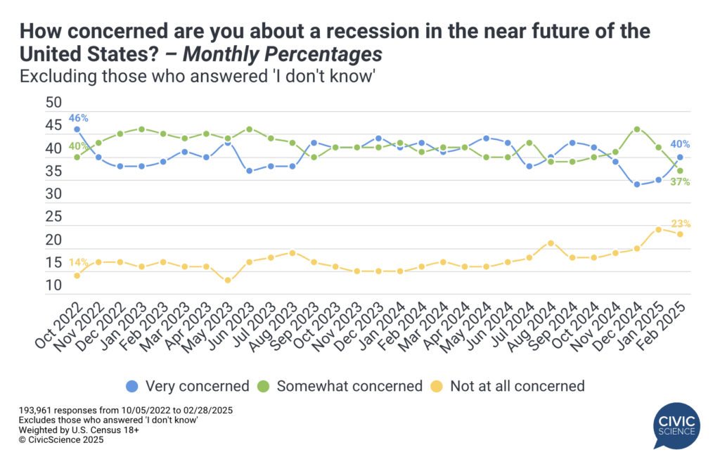 As economic sentiment declines further and Americans fear higher inflation amid President Trump’s tariff talks, could a recession be on the horizon? The latest CivicScience data from 200K+ respondents over the past few years reveal that a plurality of consumers (39%) now believe a ‘recession is coming, but is not here yet’—a level last seen in mid-2023. Meanwhile, the percentage who say ‘we are already in a recession’ has dropped to a low of 29%, while those who feel ‘a recession is not coming’ have seen a slight month-to-month increase, reaching 32%.