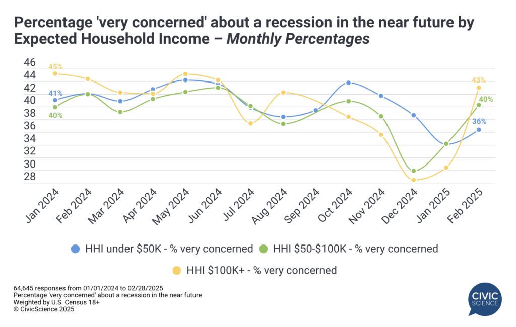 Concerns also vary by expected household income. While households with an expected annual income of under $50K reported the strongest concerns of a recession just before the presidential election, higher-income households ($100K+) – who likely have more invested – have recently overtaken all other income groups as the most concerned about a recession. This comes as the CivicScience Consumer Financial Health Index reported a drop in investing outlook.