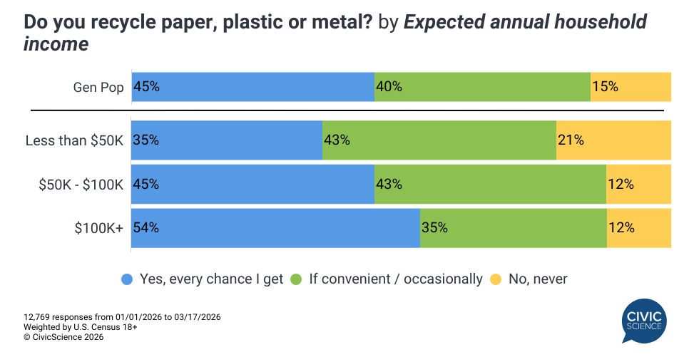 Baby Boomers (65+) and households earning over $100K are the most likely to say they recycle ‘every chance they get.’ Meanwhile, Gen Z and households earning under $100K are most likely to recycle ‘when it’s convenient,’ with those earning under $50K specifically being the most likely to say they ‘never recycle.’ Millennials also slightly lead among those who report ‘never’ recycling.