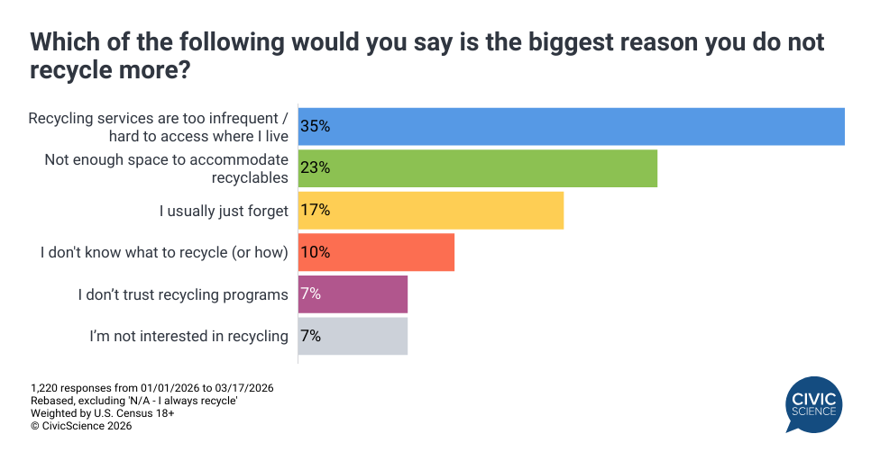 Barriers also shift by generation. Gen Z and Millennials (18-44) are most hindered by limited space and a lack of knowledge on what can be recycled. Conversely, Gen X and Baby Boomers are the groups most likely to express skepticism toward these programs or report a general lack of interest in participating.