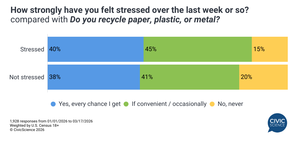 Despite the fact that the majority of Americans recycle to some degree, adoption is far from unanimous, with a variety of logistical and emotional factors likely playing a role. As stress levels remain elevated, how Americans continue to engage, or opt out of, recycling programs could shift in notable ways.