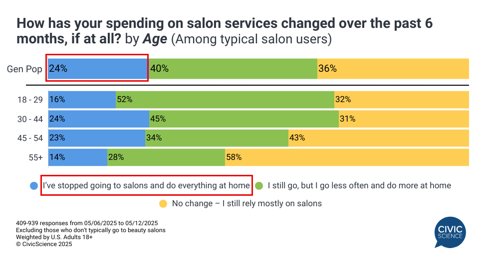 Additional CivicScience data reveal that tariff concerns are playing a significant role in driving the salon exodus. Among typical salon-goers who have fully embraced a DIY approach, 89% report being at least ‘somewhat’ concerned about the potential impact of tariffs. Likewise, 87% of those who have simply reduced their salon visits share similar apprehensions, underscoring how economic ripple effects extend well beyond the checkout line and into the everyday routines of American consumers.