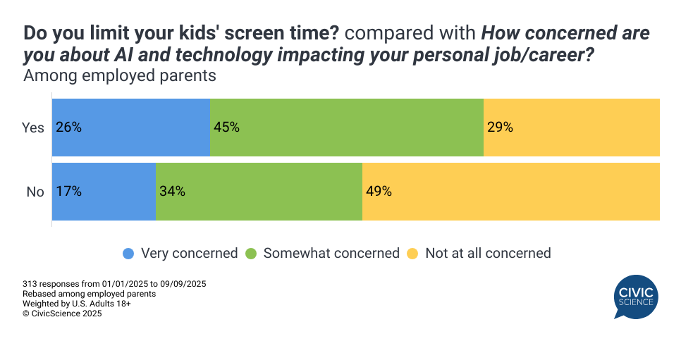 Beyond the general concern over screen time, parents who limit their kids’ screen time have other issues on their minds. Namely, those who limit the time their kids spend in front of a screen are more likely than non-limiters to be stressed. Specifically, this demographic shows the strongest concern about the impact of AI on their jobs and career outlook. With so much uncertainty, the decision to limit screen time–both for their kids and themselves–may be one of the few things they can control.