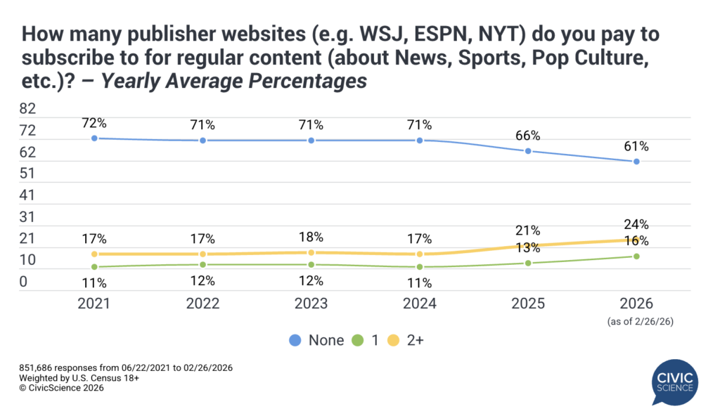 Over the last five years, CivicScience data shows some Americans have become more willing to pay for publisher content. CivicScience’s Founder and CEO, John Dick, explored this development in a recent podcast conversation with The Atlantic’s CEO, Nick Thompson. For publishers, this data challenges many assumptions. Our research provides insights into the 2026 market and identifies opportunities for media companies to capture the next wave of revenue.