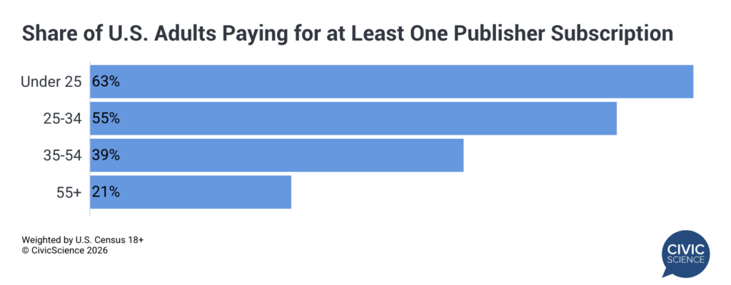 CivicScience data shows that the youngest readers (Gen Z adults, 18-24) are three times more likely to say they pay for content subscriptions than the oldest readers (55+). To capitalize on this opportunity, publishers should build experiences that reflect how today’s consumers actually engage with media.