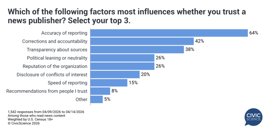 According to additional CivicScience data, the answer is both clear and somewhat traditional. Accuracy of reporting stands far above all other factors, cited by 64% of respondents who read online news content as a top reason for trusting a news source. But accuracy alone isn’t enough; audiences also prioritize corrections and accountability (42%) and transparency about sources (38%). This suggests that trust today is a matter of earned credibility, built as much on a publisher’s integrity after a story breaks as on the initial report itself.