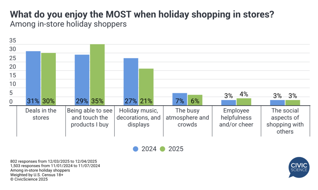 As in-store shopping may increase this year, priorities for in-person shopping are also shifting. In-store deals draw three in ten shoppers, but they have slipped to the second-most common motivator, now trailing the ability to touch products in person, which is up six points from 2024. Meanwhile, a shrinking share says holiday music and decorations are bringing them into stores, though this reason remains a top-three driver.
