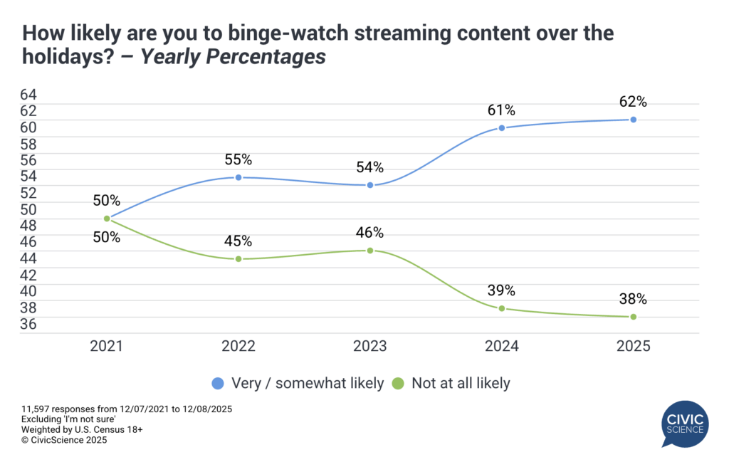 Despite ongoing video subscription fatigue and recent headlines about Netflix or Paramount acquiring Warner Bros. Discovery, CivicScience data show that over 6 in 10 Americans still plan to binge-watch content this holiday season. That’s on par with last year, and more than 10 points higher than five years ago.