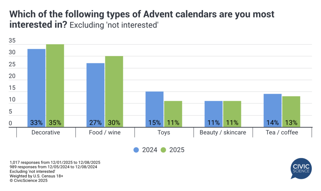 After years of holding steady, participation in an Advent calendar this season has climbed to 28%, up from 22% last year. Gen Z adults (18-29) continue to show the strongest interest, but the largest YOY shift comes from Millennials aged 30-44, rising nine percentage points since 2024.