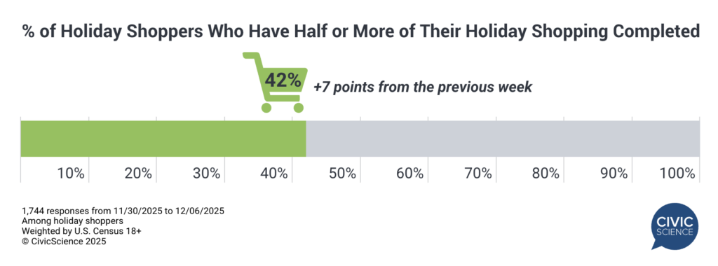 With Thanksgiving sale shopping officially in the books, the latest week of tracking shows that 42% of holiday shoppers say they’re at least halfway done with their gift buying – a seven-point increase from the previous week, which captured only the early days of the sales events.