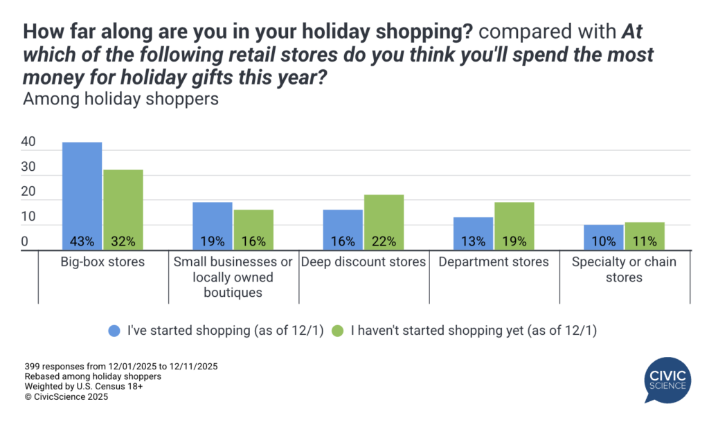 Big-box stores remain the most popular destination for gifts this year; however, shoppers who hadn’t started their shopping as of December 1 are less likely to visit them than those who were already shopping. Instead, late-starting shoppers are more inclined to shop at deep-discount retailers and department stores, and are also less likely to shop at local businesses.