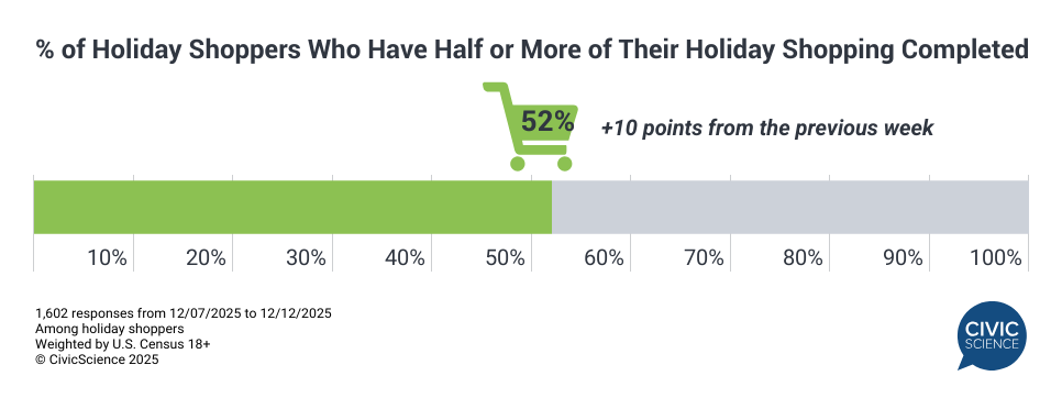 With half of December already complete, the window for holiday shopping is shrinking by the day. CivicScience’s ongoing holiday tracking shows that as of the end of last week, 52% of holiday shoppers say they’re at least halfway done with their gift buying – a 10 percentage point increase from the previous week.