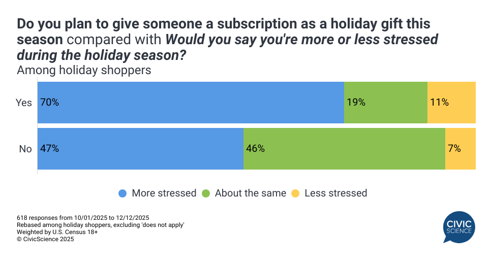 Currently, 22% of holiday celebrators plan to give a subscription as a gift this holiday season – a six percentage point increase since 2023. This option is most popular among Gen Z adults, and since the data show that those who are giving a subscription as a gift this holiday season are 23 percentage points more likely to be more stressed during the holiday season, it’s possible that subscriptions offer a low-stress way to check another recipient off the holiday shopping list.