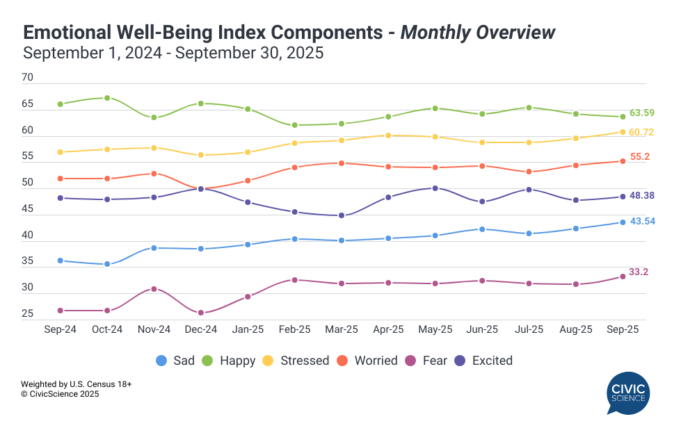 Current consumer data paints a less-than-ideal outlook, as fear, stress, worry, and sadness are all at yearly highs. Since August, fear has increased the most (1.43 points), followed by sadness (1.23 points), stress (1.14 points), and worry (0.84 points). Although happiness and excitement also increased slightly last month, the bump wasn’t enough to compensate for the combined impact of increased negative emotions.