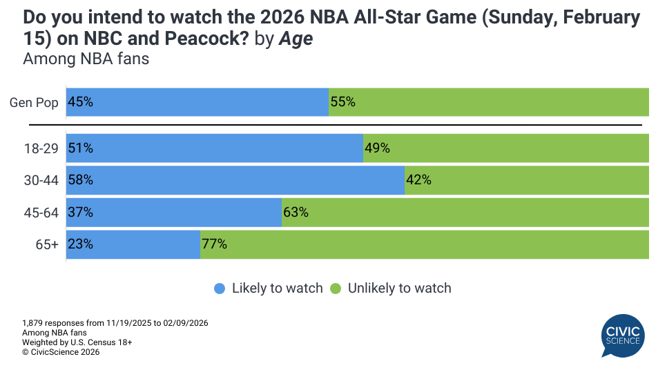 The Super Bowl may have come and gone, but the busy month of February in the sports world rolls along. The NBA All-Star Game (ASG) is up next on the docket in North America amid the backdrop of the ongoing Milano Cortina Winter Olympic Games. Self-declared intent data from CivicScience offers a preview of the likely NBA ASG audience and what it means for brands and advertisers hoping to reach them once the All-Star festivities end. Here’s what Americans are telling CivicScience about the game this year: