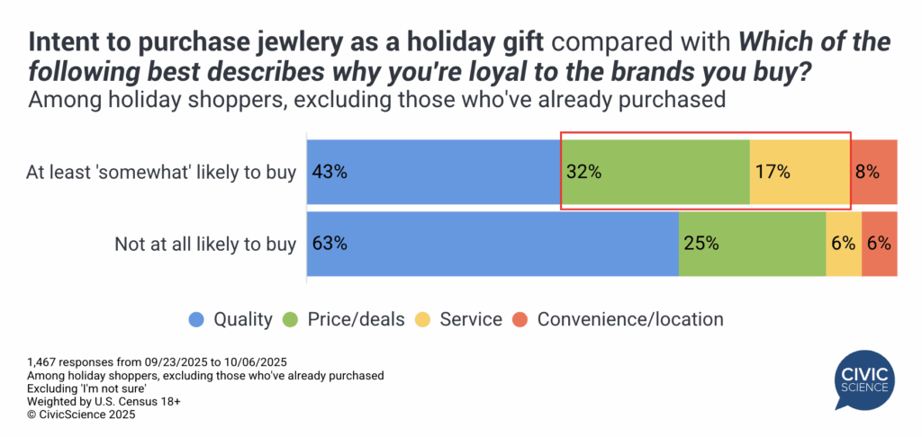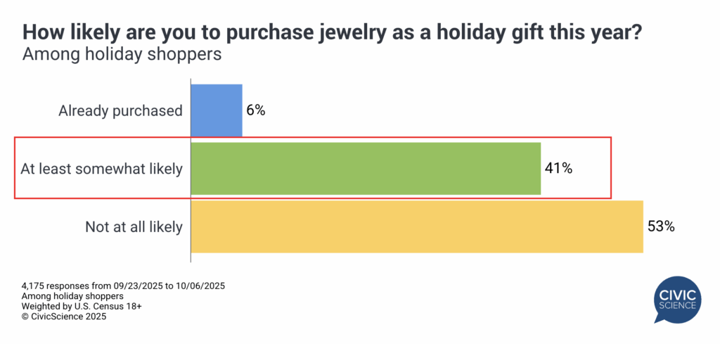 New CivicScience data show that just 6% of holiday gift buyers have already purchased jewelry, while another 4 in 10 say they’re at least somewhat likely to do so this year. This signals a prime window for brands to reach them before holiday shopping ramps up in the coming months.