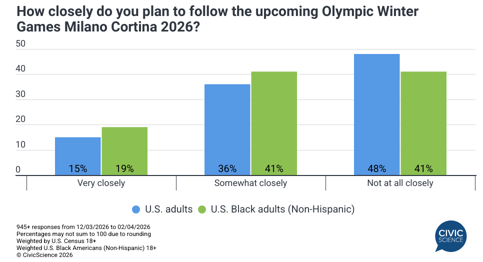 The latest CivicScience consumer-reported data finds 52% of U.S. adults say they will follow the Olympics at least ‘somewhat’ closely, a percentage that rises to 59% among Black Americans, including 19% who will follow ‘very’ closely. Like the Gen Pop, Black Americans are most interested in watching figure skating, while sliding events (e.g., luge, bobsleigh, skeleton) are their second-most-common Olympic sports of interest this year.