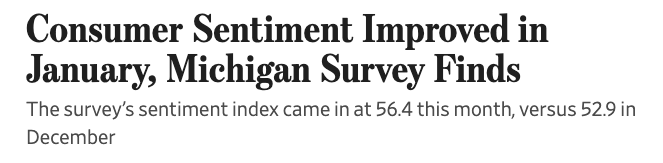Naturally, the first thing I did was check our data. Unlike UMich and the Conference Board, we publish our Economic Sentiment Index biweekly. If you read this email as vigilantly as you should, you know that our last reading on January 14th was a banger. Sentiment improved significantly during the first two weeks of the month.
