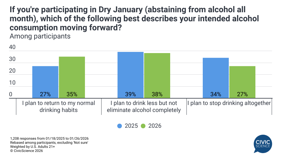 In further related news, people bailed on Dry January in droves. I guess this is a welcome development for alcohol companies – if not for public health – but once-aspiring January teetotalers fell off the proverbial wagon in record numbers this year. It’s worth noting that this year also marks the largest group of people we’ve ever seen attempt Dry January. Gen Zs were the biggest failures – nearly half of them entered the month with hopes of not drinking, only to throw in the towel. Per below, even the people who stuck with it are more likely to resume their pre-January booze-y ways this year. I suppose a bunch of geopolitical strife, economic malaise, and being stuck under a foot of snow in single-digit temps will drive just about anyone to drink.