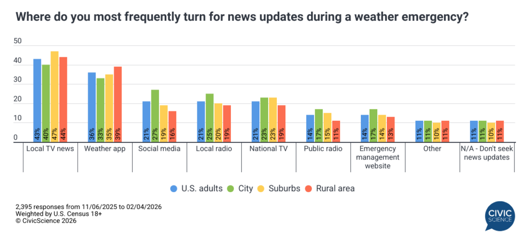 Local TV news continues to fend off weather apps as the number one place people turn during extreme weather. In our 3 Things to Know this week, we looked at how Americans are responding to the rash of brutal cold weather over the past few weeks and where they turn for information. Local news is still king, but the numbers vary across urban, rural, and suburban areas. We also learned that a proposed 10% cap on credit card interest rates draws broad public support because of course it does. Lastly, as Ford and GM look to launch their own banks to manage auto loans, we found a high level of enthusiasm for it among younger drivers.