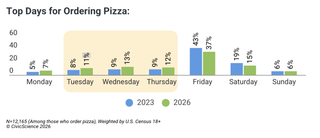 Maybe people would be happier if they ate more pizza. We published an extensive study this week on trends in pizza consumption and, as someone in a third of Americans who eat pizza at least every couple of weeks, I couldn’t get enough of it. Cherry-picking a couple of stats that caught my pie, I mean, eye: Ordering by telephone (voice) is still the most popular way to do it, but only barely. Domino’s is the number one national chain, but regionality matters a lot. Ordering pizza midweek is climbing, while ordering on weekends is falling. Anyway, there’s a lot more. Just check it out.