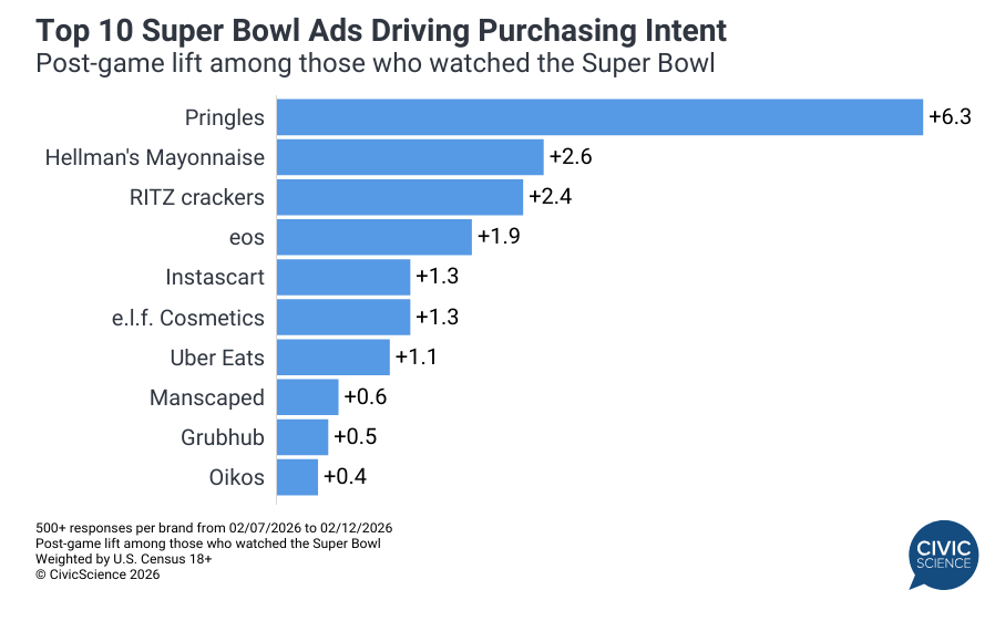 Super Bowl commercials work. Speaking of (see above) brand marketing, we published a report this week on the most effective Super Bowl ads, measured by the increase in near-term purchase intent among viewers before and after the game. The 10 brands with the biggest gains spanned categories from CPG food to beauty to delivery services and more. Looking specifically at the coveted 18-44-year-old age group, we saw particularly big spikes in intent toward Uber Eats and eos, a penchant for celebrity-endorsed products, and a lot of people who view snacking as a form of “self-care,” which makes sense given that our collective emotional well-being sucks.