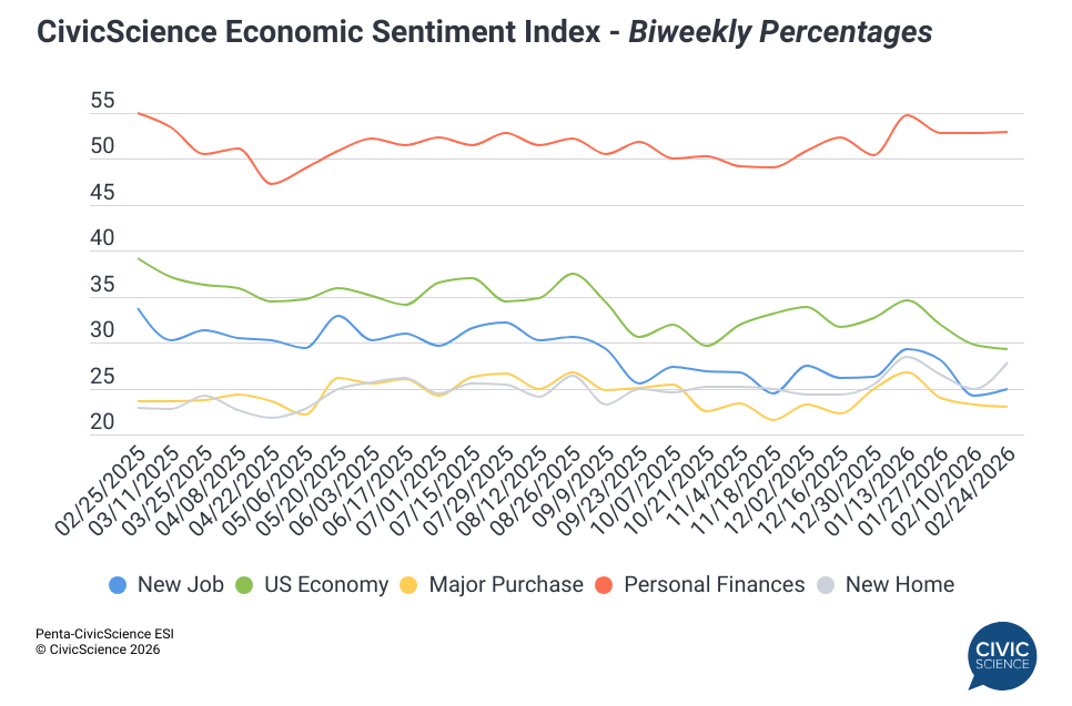 Consumer confidence had a minor rebound this week. After a complete nosedive in mid-January, our Economic Sentiment Index moved up and to the right in the latest reading as the nationwide panic over the job market reached equilibrium. Driving the gains this time around were significant improvements in optimism for the housing market – on cue, we saw mortgage rates hit a 3-year low. Americans are still feeling bleak about the long-term outlook for the economy and their eagerness to make major purchases remains muted.