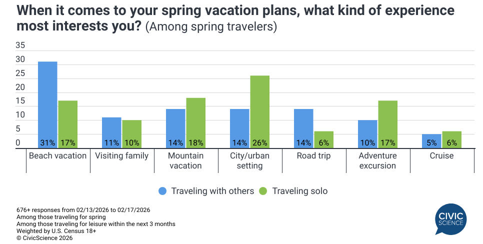 The lousy winter has a lot of people hankering for spring travel. Forty-two percent of Americans report having plans to travel for leisure in the upcoming spring months, with another 13% still on the fence about it. A large number plan to travel solo, heading to a different array of locales than people traveling with friends or family. We also took a closer look at where they plan to stay (hotels vs. Airbnbs) and the supplies they need to buy beforehand. If you’re in the travel business, the good news is that most of them haven’t booked everything yet, so there’s still time to hook them.